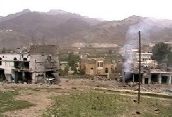 A handout video grab distributed on August 12, 2009, shows smoke billowing from buildings in the Haydan district.